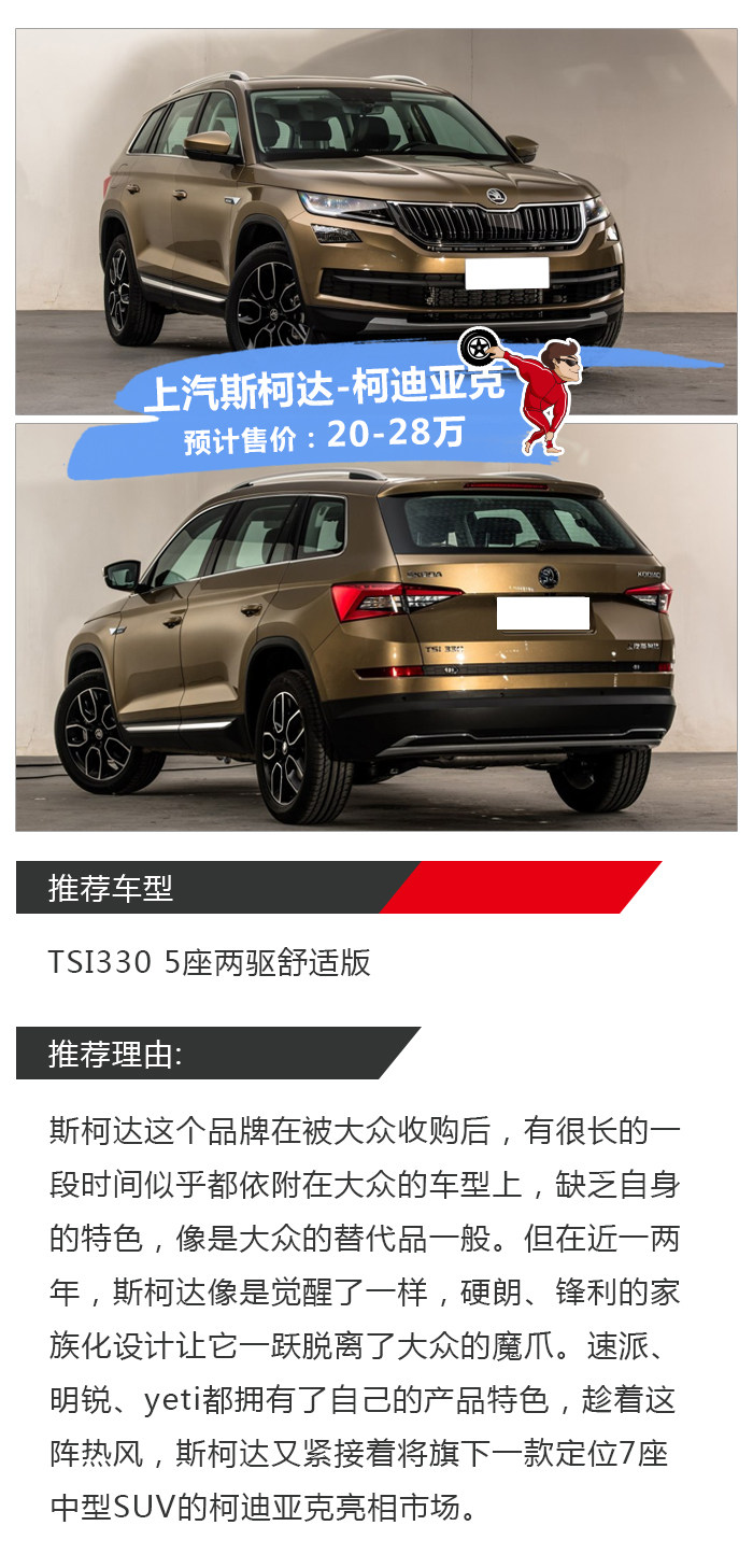 虽说并未披露售价但按照斯柯达一惯的作风,将会比同级的大众车型定价少2-3万,而途观L 的最低售价仅为22.38万,那柯迪亚克的售价估计仅需20万出头。