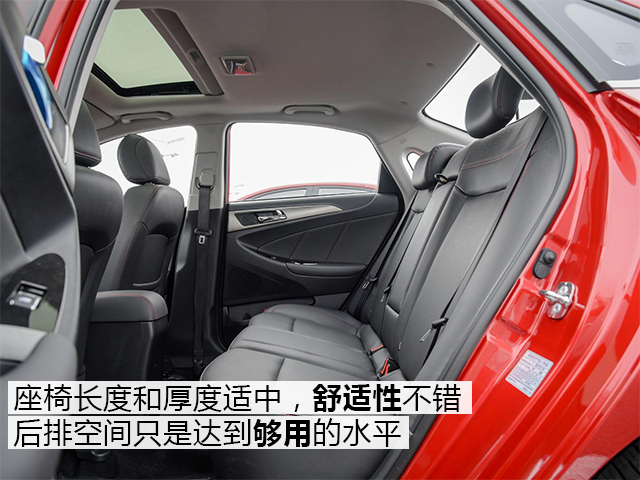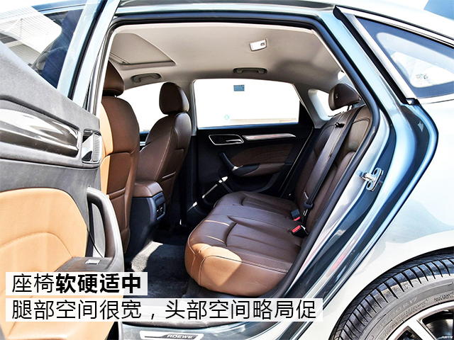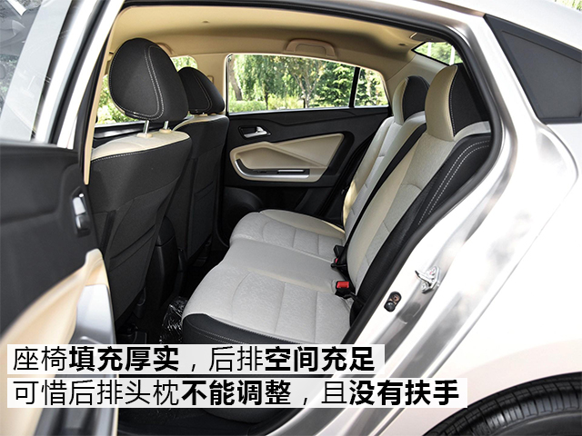 乘坐方面,能看到荣威i6的座椅填充还是相当厚实的,同时座椅的横向宽度充足,身高180cm的体验者在后排能取得两拳的腿部空间和三指的头部空间,除了头部稍压抑之外,i6的后排舒适性还是值得肯定的。