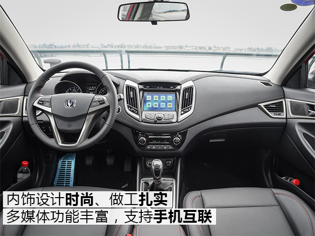 内饰值得称赞的地方是逸动比较扎实的做工,接缝比较均匀,而且各个按键的质感都很不错,没有传统印象中的“嘎嘣脆”的现象。中控台也取消了旧车型密密麻麻的物理按键,多媒体系统也支持百度Carlife手机互联、自动泊车等功能,相当实用。