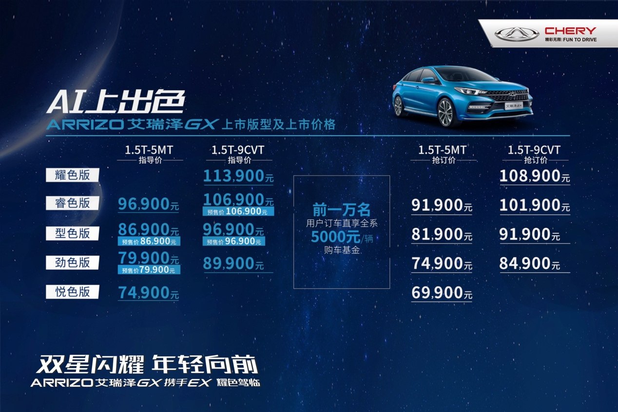 本次发布的艾瑞泽GX提供两种动力总成配置共五种不同版型,售价为7.49万—11.39万元,前一万名用户订车直享全系5000元/辆购车基金,具体如下: