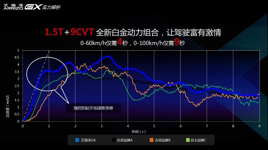 高性能。艾瑞泽GX搭载的1.5T+9CVT高效白金动力组合,拥有37.1%的发动机热效率,油耗低至百公里6.4L,同时配合9CVT的SPORT运动模式,让艾瑞泽GX拥有出色的爆发力和运动性能,0—60km/h加速时间仅需4秒,百公里加速更只需9秒。