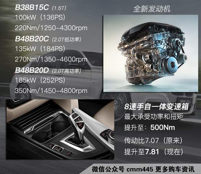 说到宝马必须提到其动力总成,曾经的N20等系列发动机已经富有足够知名度,而全新宝马3系则更是升级了动力系统,换装了B38/B48等系列机型,同样有着世界年度发动机大奖以及沃德十佳发动机的双重荣誉称号。匹配的则是改进版8速手自一体变速箱。