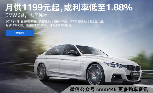 如果你有兴趣拥有宝马3系但又局限于不太充裕的资金,宝马提供的金融方案可以帮你解决问题。从即日起到6月30日止,购置宝马3系国产车型,便可享受低至20%的首付,12-48个月灵活贷款期限,利率低至1.88%,并有弹性尾款或者年度还款,折算下来最低月供最低仅为1199元。