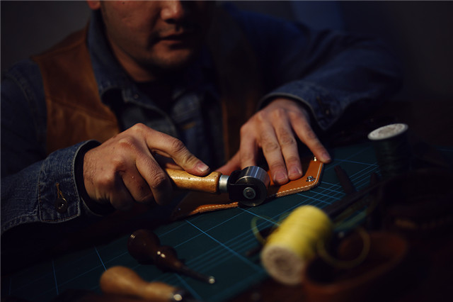 张锐在北京开着自己的工作室,在圈里颇有名气。除了开设体验课,他还自己设计制作皮具。毕业于设计专业的他也在大公司上过班,但他还是喜欢静下心来做自己喜欢的事。一针一线都是专研,他在平凡的生活中坚守一颗心,同样坚守一份匠人精神。