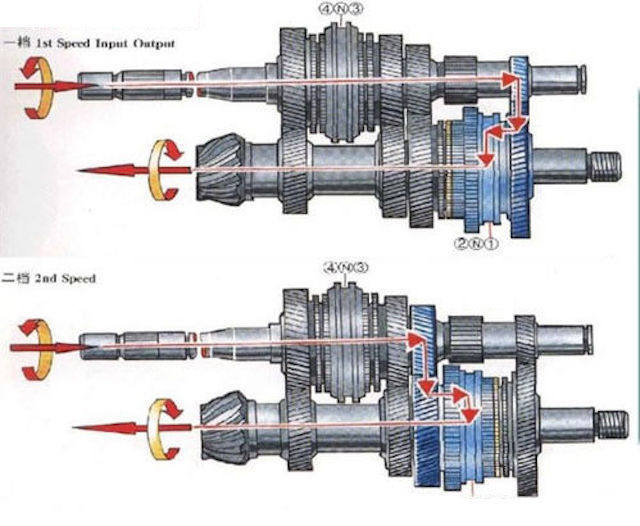 当车轮转动时同样会带着花键轴一起转动,此时,轴上的蓝色齿轮可以在花键轴上发生相对自由转动。因此,在发动机停止,而车轮仍在转动时,蓝色齿轮和中间轴出在静止状态,而花键轴则随车轮转动。这个原理和自行车后轴的飞轮很相似。蓝色齿轮和花键轴是由套筒来连接的,套筒随着花键轴转动,但同时也可以在花键轴上左右自由滑动来啮合齿轮。