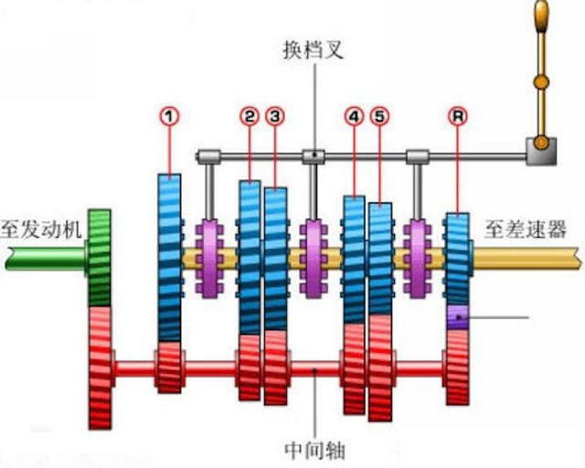 输入轴(绿色)也叫第一轴,通过离合器和发动机相连,轴和上面的齿轮是一个硬连接的部件。红色齿轮轴叫做中间轴。输入轴和中间轴的两个齿轮是处于常啮合状态的,因此当输入轴旋转时就会带动中间轴的旋转。黄色则是输出轴,它也叫第二轴直接和驱动轴相连(只针对后轮驱动,前驱一般为两轴),再通过差速器来驱动汽车。