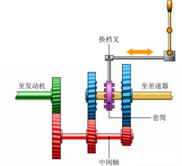 到这里,换挡的过程就很好理解了,当套筒和蓝色齿轮相连时,发动机的动力就会通过中间轴传递到输出轴上,在这同时,左边的蓝色齿轮也在自由旋转,但由于没有和套筒啮合,所以它不对花键轴产生影响。而如果套筒在两个蓝色齿轮之间时,变速箱在空挡位置,此时两个蓝色齿轮都在花键轴上自由转动,互不干涉。
