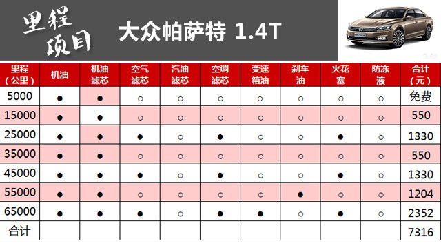 小结:与多数中型车不同的是,帕萨特的保养间隔较长,1万公里才需要进行一次保养项目。不过,即使如此,帕萨特6.5万公里累计下来的保养成本也达到7316元,一次小保养价格为550元,虽然在同级别优势并不大,但这样的价格对于大部分用户的接受度还是较高的。