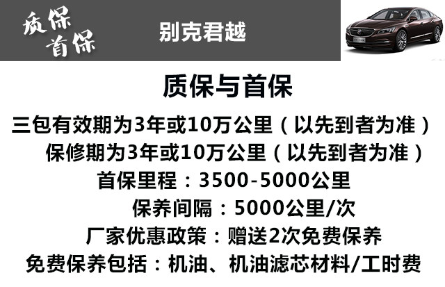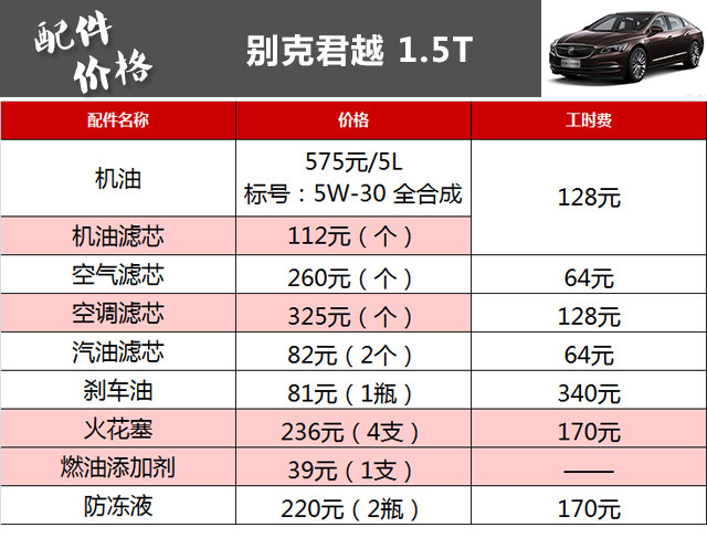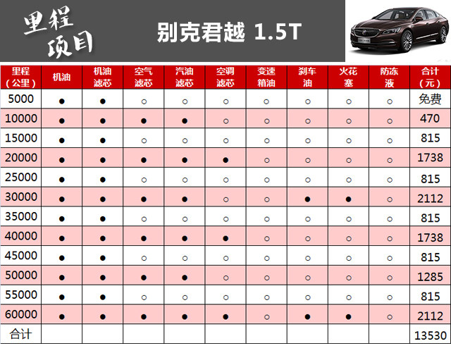 小结:从保养数据上可以看到,君越1.5T的保养价格在同级别可算不上便宜,6万公里共计花费13530元,一次常规小保养也要815元,这或许与君越使用高品质的全合成机油有关,当然,一分钱一分货,用好点、贵点的产品未必不是一件好事,而且厂家还为君越提供了2次免费保养的机会。