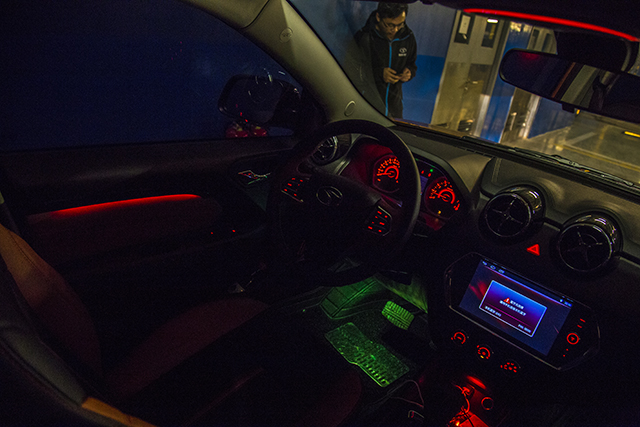 内饰的设计没有任何变化,只要是方向盘、座椅使用了红色/橙色的配色,比较惊讶的是SRG车型竟然配备了内饰氛围灯,分布在四个车门和车顶的天窗控制区域,车辆处于正常模式下氛围灯是白色的,切换到运动模式后,氛围灯和仪表盘都会变成红色。