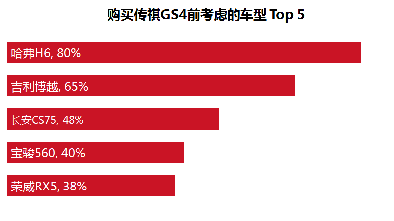 要不怎么说是哈弗H6的宿敌?在接受调研的200多名车主中,80%在购买GS4之前都曾考虑过哈弗H6!紧跟随后的是博越,同样也是目前较为热门的车型,只是油耗略高的问题让不少人转而投入了GS4的怀抱。其次长安CS75、宝骏560也是重点考虑对象。值得一提的是荣威RX5,尽管还算是新面孔,但它的关注度同样上升得很快。