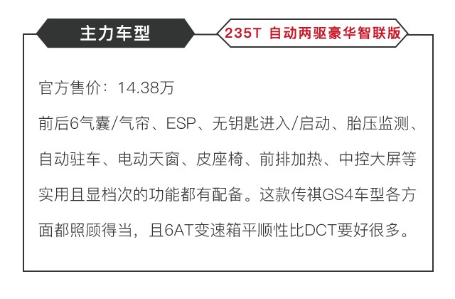 carsong(2017款 235T 自动四驱豪华智联版):裸车价13.98万元,就便宜了几千块钱,在洛阳这地GS4的价格好坚挺啊!目前来说个人觉得比较满意的是空间还有油耗,1.5吨配1.5T动力储备没有太大问题,因为怕双离合问题选了6AT,不过调校其实也差点火候,起步提速不那么积极,但一个比较懂车的朋友说这样是为了省油--好吧,我认了。
