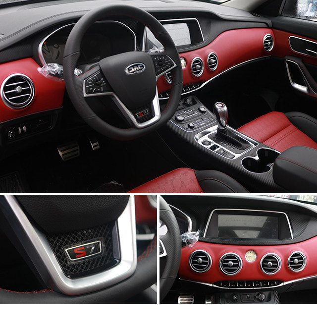 在车内最常用到的配置上,全液晶仪表盘以及抬头显示的加入更能提高整车的逼格,平底式多功能方向盘采用了红色缝线以及仿碳纤维的装饰件给人的运动感十分强烈,而且底部还有一个S7的标识。