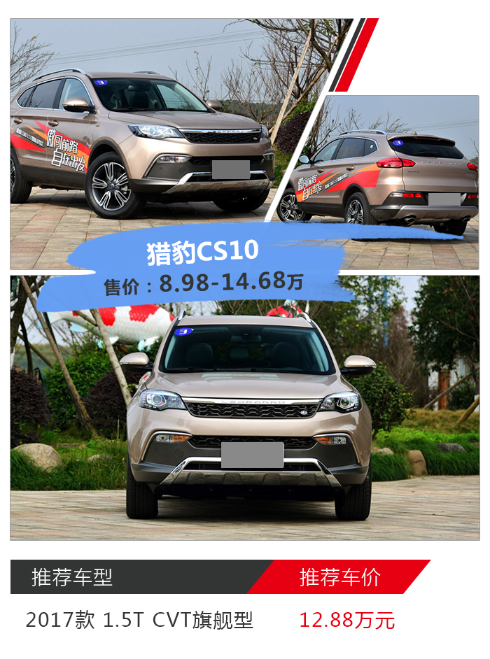 猎豹CS10提供了1.5T和2.0T两款发动机,从经济角度出发,CS10 1.5T发动机+CVT变速箱的动力总成更值得推荐,低扭确实偏弱,只有当转速达到1800rpm时才能感受比较充沛的动力响应,CVT变速箱的特性也保证了整个加速过程的平顺性。由于是后独立悬架形式的缘故,CS10的乘坐舒适性也颇为满意。