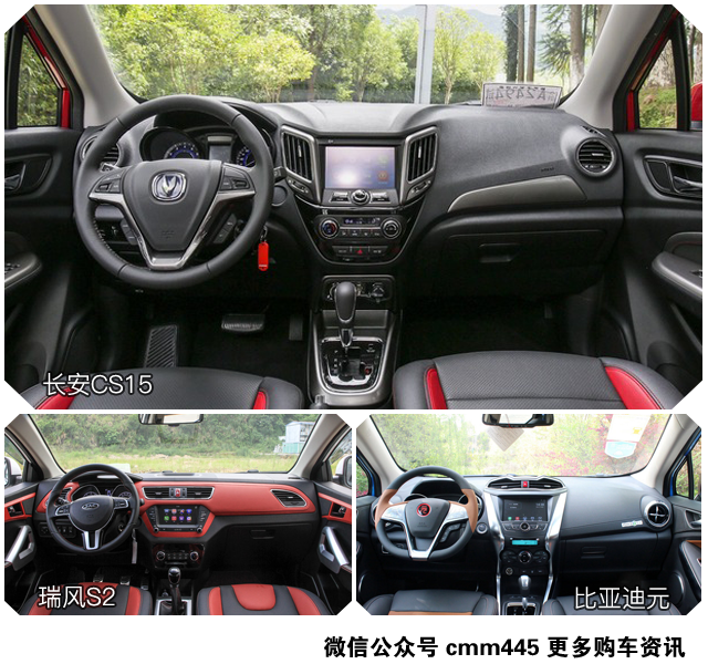 竞品如长安CS15在内饰用料上则比较一般,几乎全是硬塑料包裹,档次感不足;而比亚迪元则较多地覆盖软性材质,用料比较厚道;至于瑞风S2,它倒是很会营造时尚感,除了大胆的配色外,在中控台上的红色区域可真是皮革,虽然不会给你太细腻的质感,但也足以看得出它的诚意。