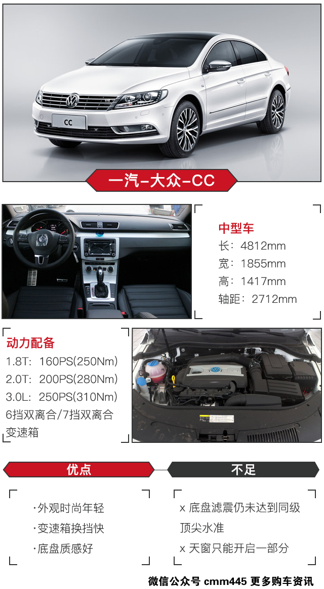 CC在大众家族中可以说是一个异类,唯有它拥有如此年轻而又轿跑化的外观设计。入门级车型的动力组合为1.8T+DSG,在市区中驾驶时,会觉得这车有劲使不出,被困着难受。特别在低速蠕动时,DSG变速箱的换挡动作还是不够自然。