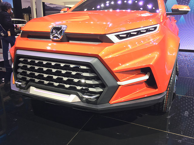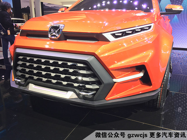 不规则型的进气格栅很有江铃驭胜家族式设计风格,下方两侧的拖车钩则更像两颗獠牙,视觉冲击力强,新车没有采用夸张的大灯组,而是选择细长型的大灯,和进气格栅形成强烈的对比。