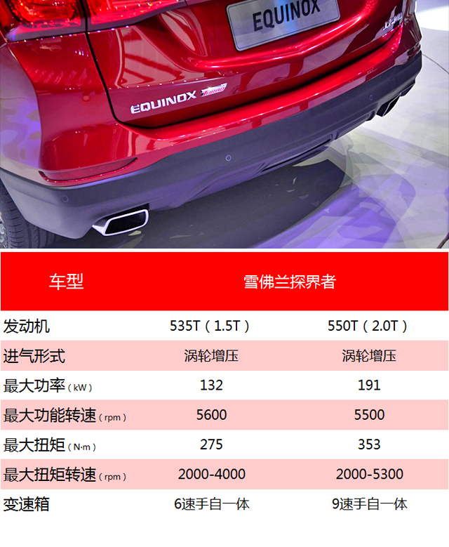 在动力方面雪佛兰探界者提供了两款涡轮发动机供消费者选择,分别是1.5T+6AT和2.0T+9AT两套动力总成,而在尾标上,1.5T排量发动机对应了535T的尾标,2.0T对应550T的尾标。在这个被尾标数值玩坏的社会中,探界者这一套尾标数值的算法依旧是一个迷。另外在动力方面教授认为亮点依旧是属于2.0T版本车型,毕竟通用这一台6AT变速箱也已经征战沙场多年,而2.0T版本上则是采用了通用自家最新研发的9AT变速箱,同样这一个变速箱也被应用到全新一代的君威上。至于表现如何,我们还得通过日后的试驾活动后才能详细说明,但9AT变速箱确实是同级罕有的存在。