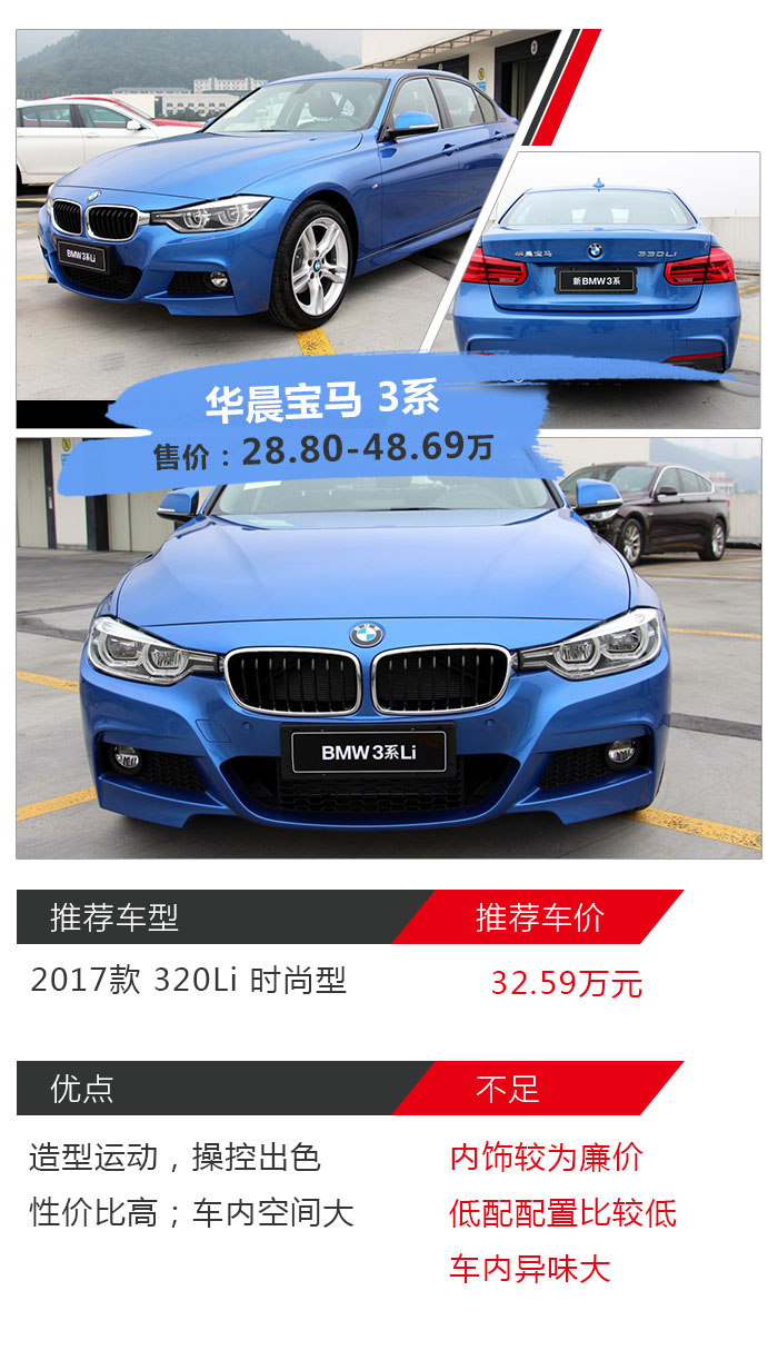 动力一向都不是宝马的强项。一切以大马力为运动前提都是耍流氓,不然开始赛道试试,看宝马不虐你。作为以运动著称的3系,一直坚持着后驱布局,这才是它的特色。不过要说买哪款?还是320Li长轴距比较好,因为它的配置与性价比都很出色。