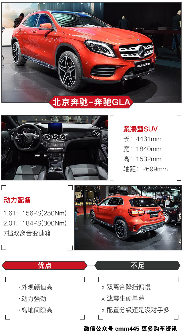 奔驰一直给人的感觉就是高大上,有逼格。奔驰GLA是奔驰SUV家族里个头最小的一款,然而奔驰GLA并不是和其它车型走成熟稳重路线,而变得相当个性前卫。内饰的设计依然是我们熟悉的奔驰,用料讲究以及拥有豪华的内饰氛围,与同级别车型相比有一定的优势,奔驰GLA上市后便成为热门的车型。要想想20万左右就能买到颜值这么高的奔驰,我还买主流B级车?