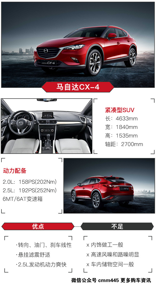 马自达一直是以创驰蓝天发动机技术以及魂动设计和不错驾驶乐趣作为卖点。CX-4的操控性能如不比其它车型差,低速时方向非常轻盈灵敏,而且它拥有较低的驾驶坐姿让你错以为自己开的是一台轿车。马自达为了尽可能保留驾驶乐趣,从而打破常规造出CX-4,结果获得了较高的关注度,上市后的市场表现也不错,给低迷的马粉打了一剂鸡血。