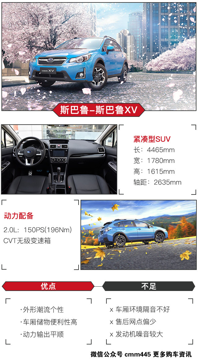 斯巴鲁XV就是翼豹加高底盘后的车型,它跟其它的车型都是一样显得非常低调,而斯巴鲁品牌最大的特点就是体现在出色的性能上面,XV也是在国内能买到最便宜的斯巴鲁车型。20万就能拥有水平对置发动机以及左右对称的四驱系统,具有较高的性价比,这对一直迷恋驾驶的人来说有着很强的吸引力,外观造型也足够抢眼。