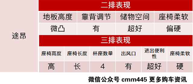 途昂可谓是四年磨一剑的产品,也是令上汽大众完善产品线布局的一款定心丸,超过5米长的车身长度,无论是第二排还是第三排的腿部空间都令人满意,座椅的长度足够长,坐姿非常好;而且行李箱空间也是本文车型中最大的,综合实力很强,妹纸都笑开了花。