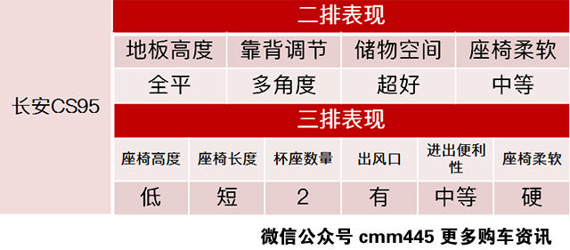 长安cs95作为自主品牌7座SUV的佼佼者,其表现自然不会令人失望,虽然说外观设计颇受争议,但是实用性方面没毛病。座椅的柔软度和贴合度做得很不错,空间也足够宽敞,妹纸表示挺享受的,举双手为CS95点赞。