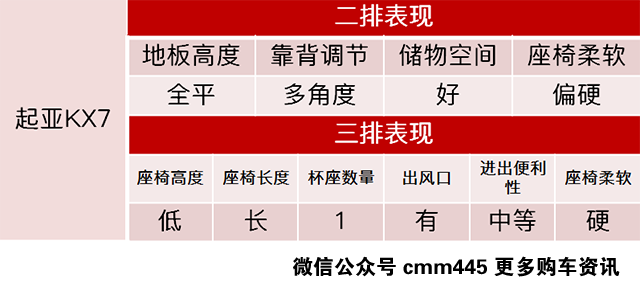 对于起亚KX7这款车,妹纸表示有点失望,毕竟其4730mm的车身长度比标致5008长了不少,不过第三的腿部空间只有三指,虽然宽厚的座椅柔软度不足,但是坐姿还是比较好的,起码第三排座椅不是小板凳了。