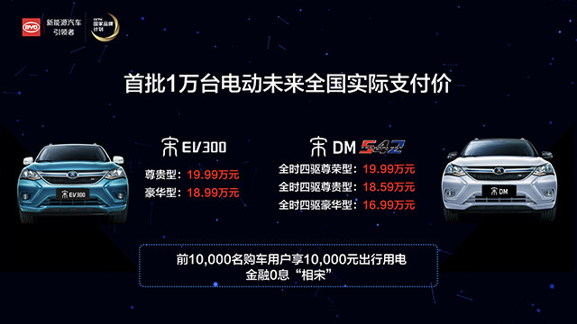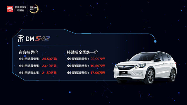 宋DM补贴后全国统一价为17.99万元—20.99万元,比亚迪将宋平台的技术亮点及五星安全保障扩大到整体,渗透到每一款不同动力的车型上。“三电”核心技术(电池、电机、电控)是比亚迪的看家本领。宋DM和宋EV300,就是这项技术日臻完善的产品。宋DM、宋EV300上市前,进行了总里程超过一百万公里的各种专业测试,给每一位用户“百万公里”的信心与保障。