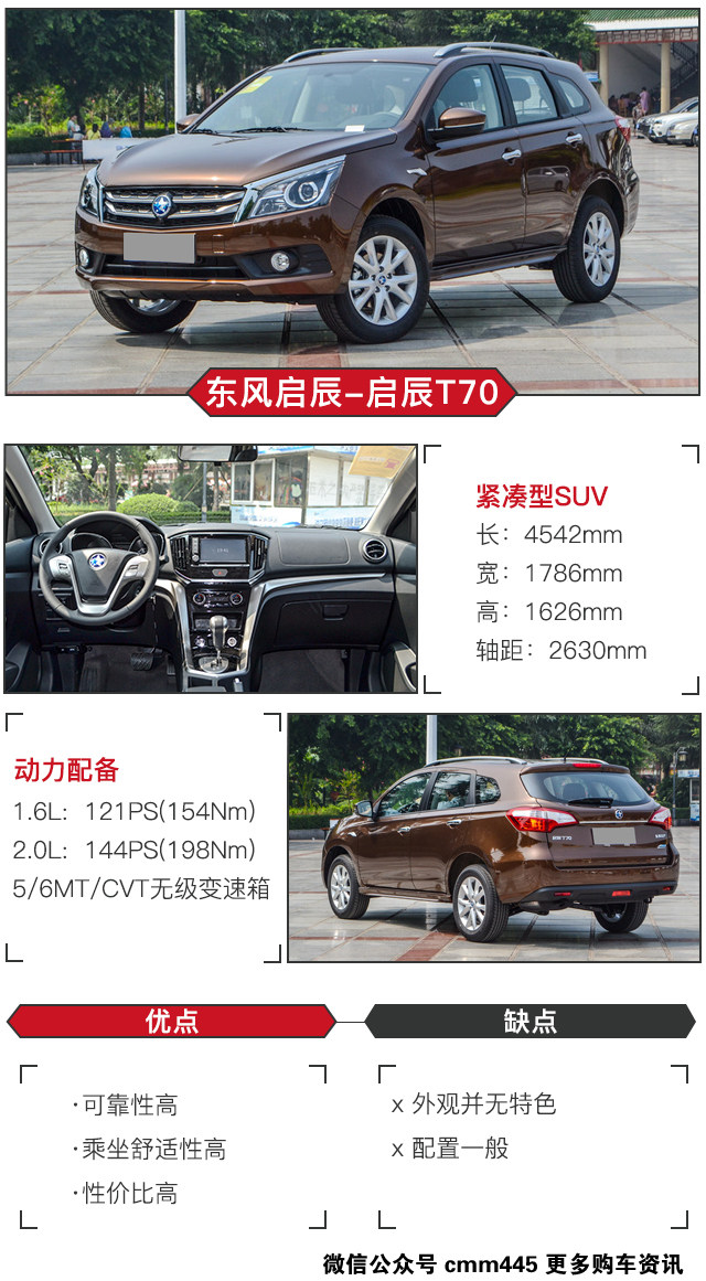启辰T70的血统相信大家都有所了解,出自日产PC平台,这平台下的产品有日产上一代奇骏、新款逍客以及雷诺科雷傲。更准确的说就是,T70就是逍客的换标车型。虽然车身尺寸、发动机、变速箱都与逍客几乎保持一致,但在空间上比逍客更胜一筹,发动机技术成熟可靠,完全就是合资品牌的“克隆”产品,也正因为是这点,T70目前销量还不错,月均有5000+辆。