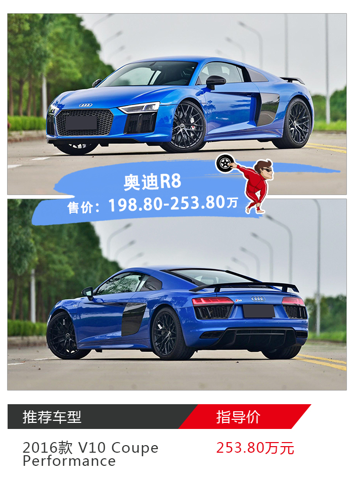 奥迪R8是一辆钟情于自然吸气的跑车,大排量、V10、V8、四驱,酷炫的外形,强暴的性能,让它一直活跃于跑车阵营里,R8 V10 Coupe(硬顶版)及R8 V10 Spyder(敞篷版)也在这个月的14号正式上市。