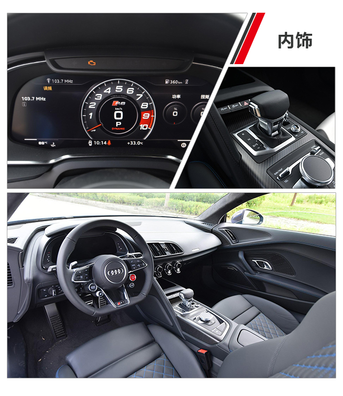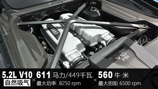 R8 V10 Performance,5.2FSI V10自吸发动机,在不借助涡轮增压的前提下爆发出611马力的最大功率与560牛·米的峰值扭矩,发动机带有双喷射系统,配备干式油底壳,7速双离合变速箱自带LSD,看不懂不要紧,反正就是特别牛逼,发动机还带有闭缸功能,这个功能在RS6上已经体验过,的确是对油耗有帮助。