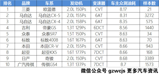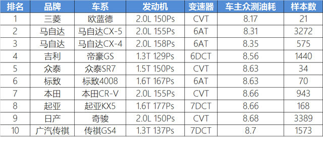 这是进口欧蓝德的排名,但实际上广汽三菱的欧蓝德和进口欧蓝德几乎无异,它们采用同样的发动机、同样的变速箱、同样的外观,所以进口三菱欧蓝德的油耗可以作为国产欧蓝德的参考。2.0L的欧蓝德搭载了三菱的4J11发动机,其最大的特点是搭载了三菱的看家技术MIVEC,再配上较轻的车身重量,就能够做出百公里8.17L的油耗,相当出色。