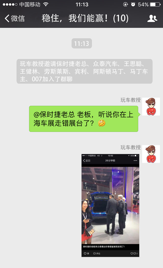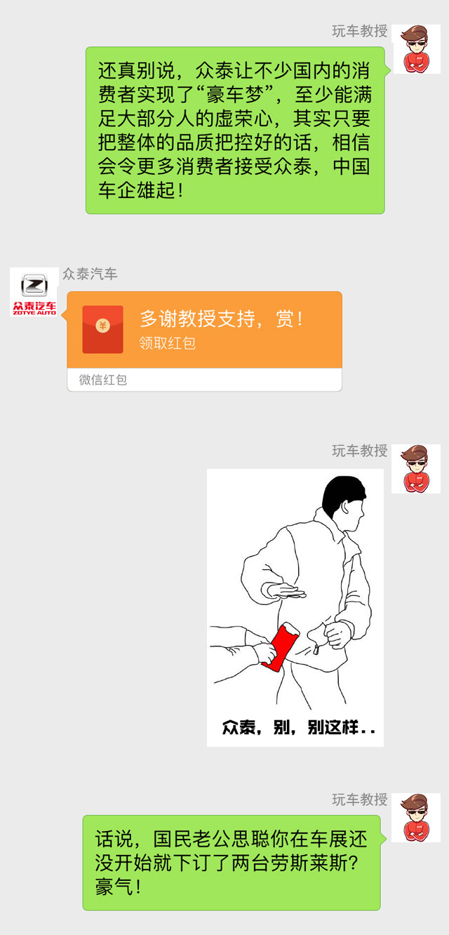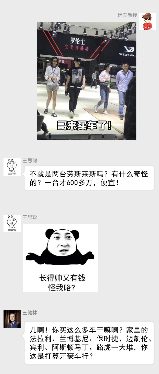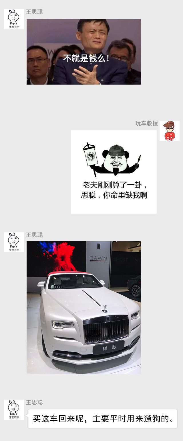 除此之外,车展上的花边新闻也非常有意思,保时捷老总误进众泰展台、国民老公王思聪在车展开幕前连买两台劳斯莱斯、阿斯顿·马丁车主拉横幅展台投诉,很可惜没有大家期待的哪位车模或礼仪大尺度走光这样的新闻,这次教授就来挖一下这几个花边新闻,试采访下上面几位主人公当时候的想法,其实如果不是王思聪早到几步,教授就把那两台劳斯莱斯收入囊中了。