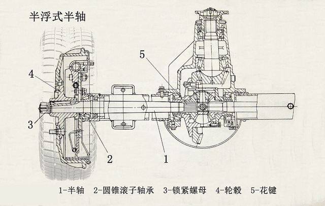 半浮式半轴以靠近外端的轴颈直接支承在位于桥壳外端内孔中的轴承上,半轴端部以具有锥面的轴颈及键与轮毂固定连接,或用凸缘直接与车轮轮盘及制动毂相连接。因此,除传递转矩外,还要承受车轮传来的垂直力、驱动力和侧向力引起的弯矩。半浮式半轴因结构简单、质量小、造价低,应用于乘用车和部分同用车上。