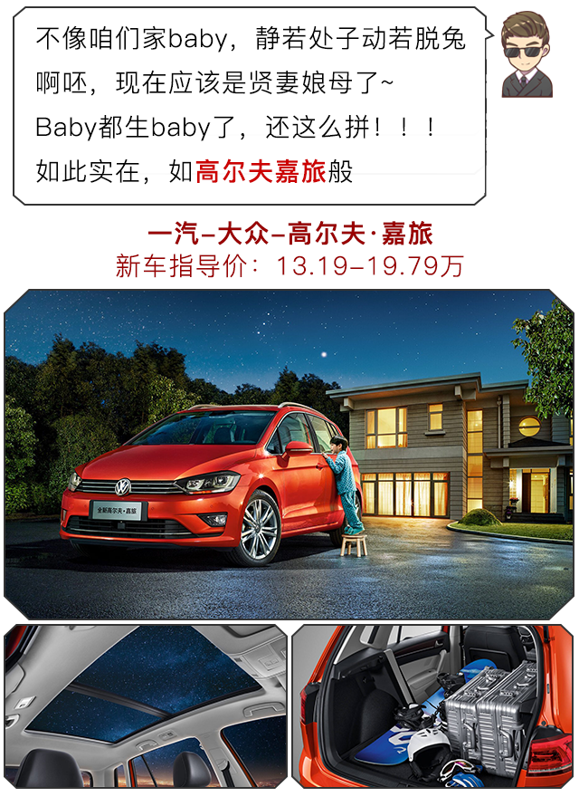 1、高尔夫嘉旅是跨界旅行车。适合家里刚有小baby的人哦~