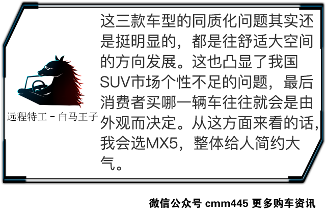 MX5这款车的外形还是值得好好说一下,大嘴式的镀铬中网,简单霸气很耐看。两组大灯与中网相连,则表现出良好的一体感。侧面腰线贯穿到车尾,很帅气,一体式的尾灯造型隐约有点像林肯的MKX。