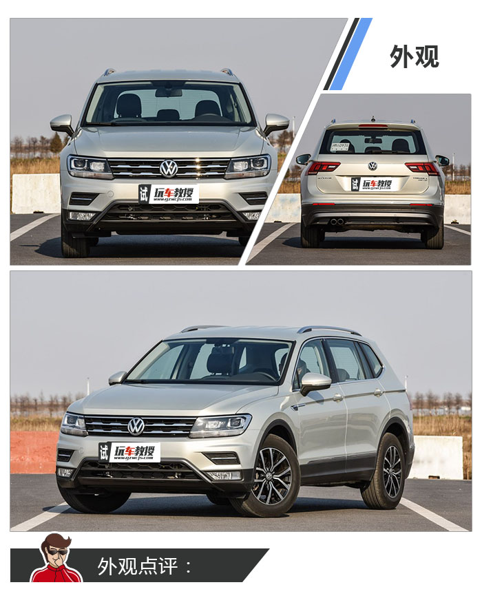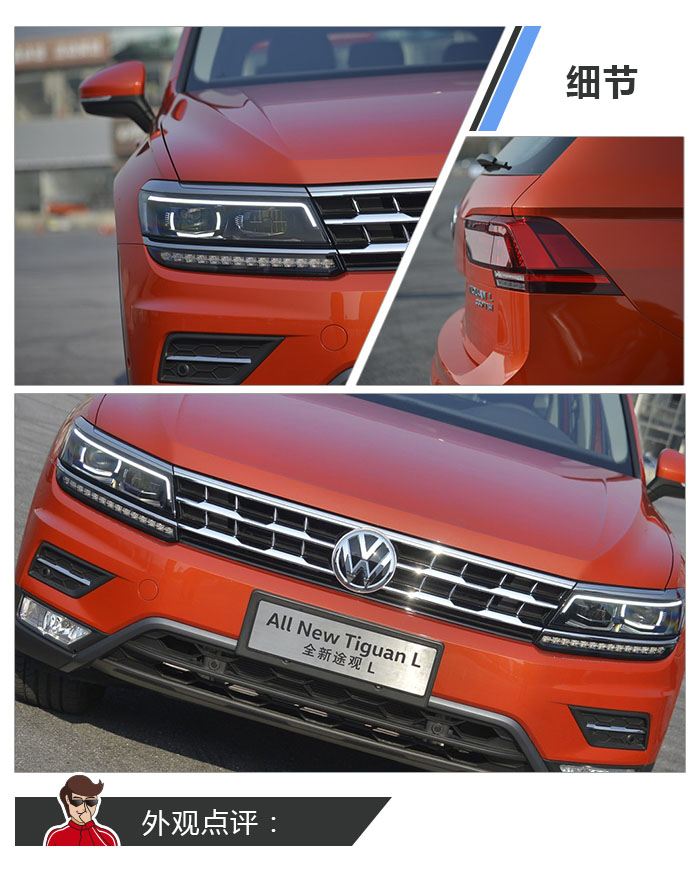 全新一代的途观L采用全新家族式的造型设计,整体的视觉效果变得更加硬朗。铠甲式的进气格栅配合镀铬装饰横行拉伸,使得前脸的视觉宽度更大。车身棱角分明的线条延伸到尾灯附近,因此就算是加长了之后也不容易看出;车尾简洁立体的造型比老款途观好上不少。