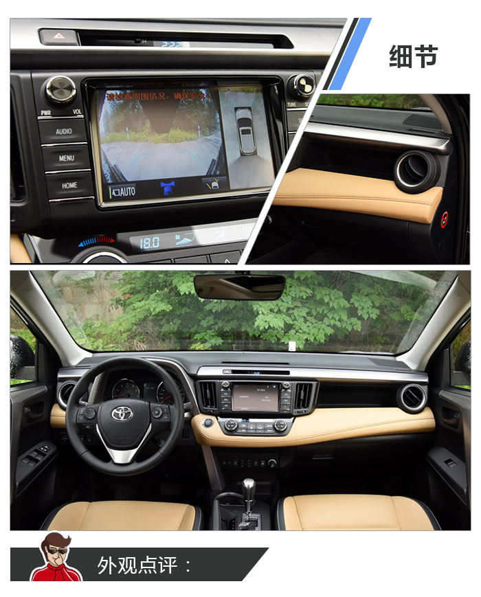 现款的RAV4 虽然属于改款车型,不过它的外观可是采用了全新的家族式设计语言。更具立体感的前脸造型显得更加年轻;配置方面相比老款也有一定的提高。例如其除了最低配之外都搭载了全景摄像头,而且全系标配ESP也是以前老款所不具备的,进一步提升了竞争力。