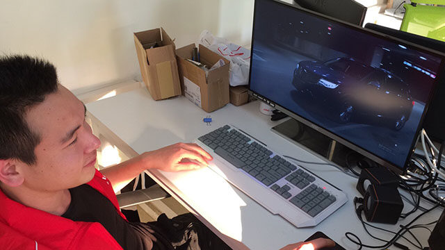 大家的女神,我们的专业试车屁股-小乔专心的蹲在电脑前,旁边是我们帅气的指挥家演员