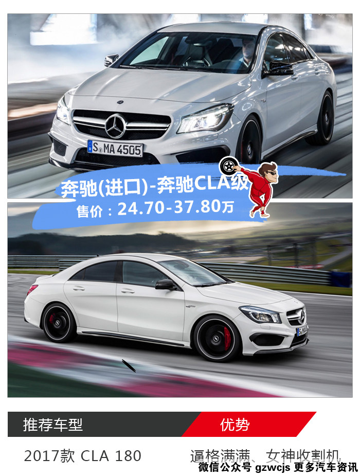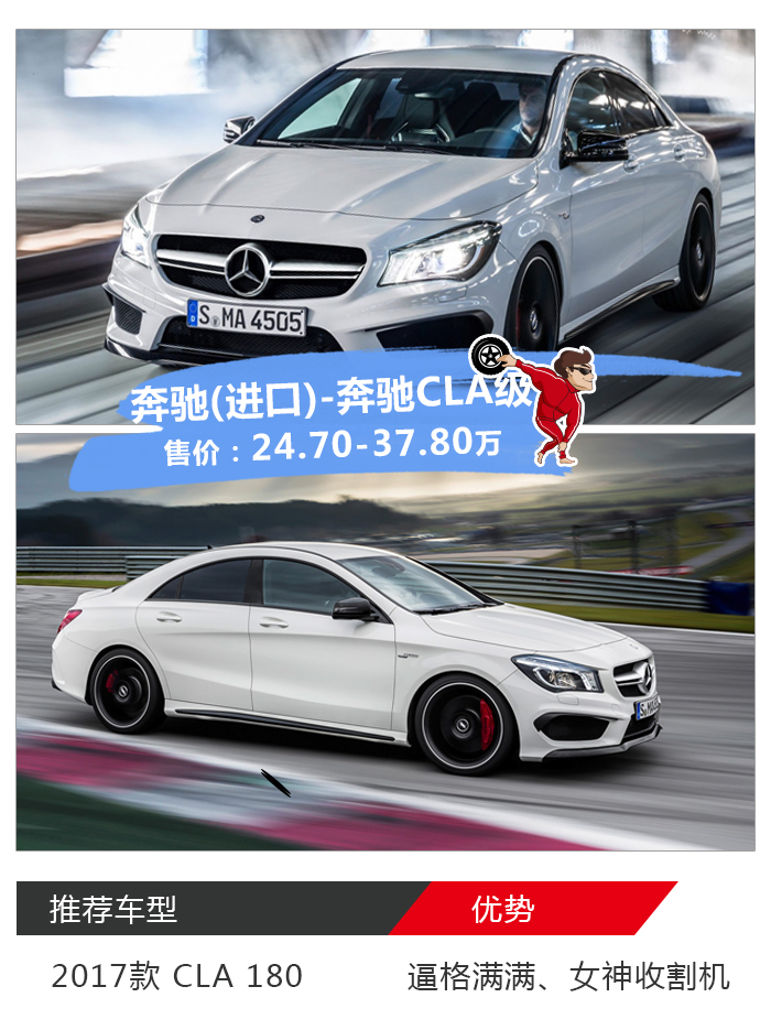 那咬咬牙来辆进口奔驰这够她喝一壶了吧,新世代的奔驰车头的三叉星一个比一个大,哪怕是奔驰标榜运动的CLA依然不落人后。要数百年奔驰历史中最帅的几款车型,我认为除了鸥翼门的300SL以外,有着优雅线条的CLS依然不可忽视,但CLS的价格明显超出了老王的预算,那有着小号CLS之称的奔驰CLA则成为了最具性价比的颜值帝。