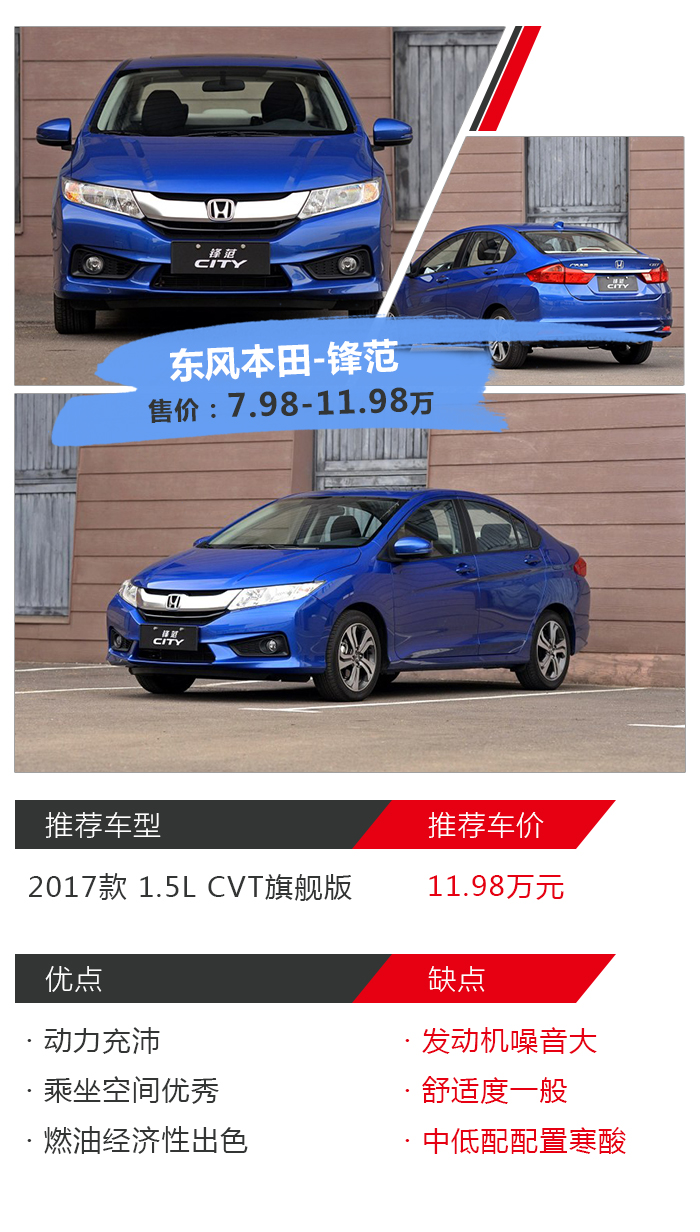 都说买本田发动机送车,此话用在锋范确实是名不虚传,三款轿车均搭载着1.5L自吸发动机,但锋范的动力参数却是最抢眼的,搭配上经济调校的CVT变速箱,可以说锋范超乎预料的兼顾了强动力与低油耗。但唯一不足的是恼人的发动机噪音,以及有待提升的NVH和行驶品质。