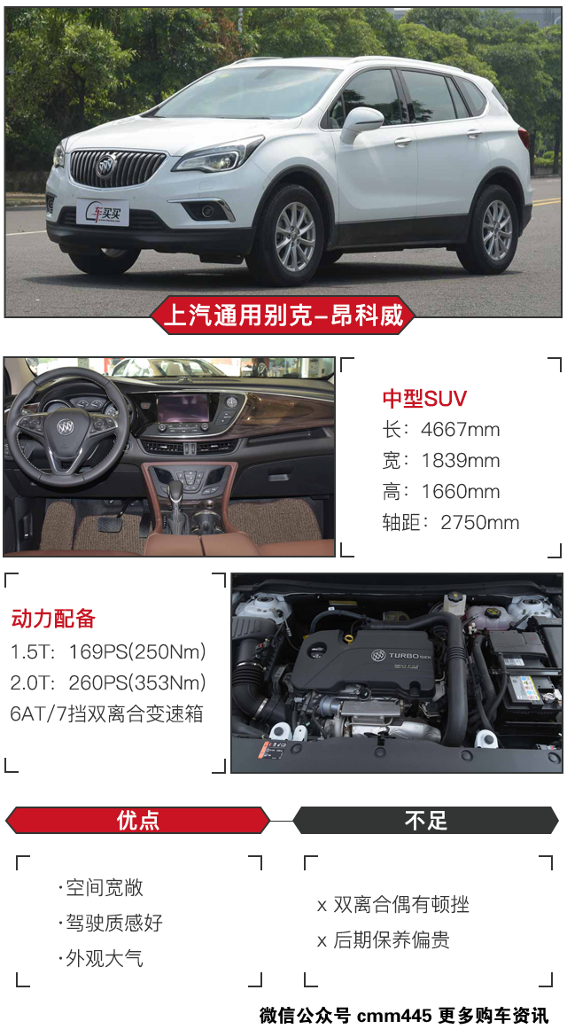 昂科威的在配置上也不含糊,最低配车型便有无钥匙进入与启动、电子手刹、后驻车雷达、日间行车灯和后座出风口。我推荐买23.59万的20T 两驱精英型,带有全景天窗、定速巡航、倒车视频影像和中控台彩色大屏等实用配置。