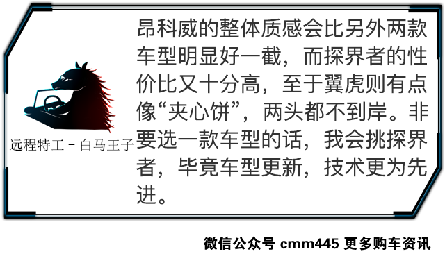 配置上,探界者同样可圈可点。全系标配胎压监测、无钥匙进入与启动、电动天窗、后驻车雷达、中控台彩色大屏、日间行车灯和后座出风口。我会推荐买22.99万的550T 自动四驱拓界版,动力更为强劲,9AT变速箱的输出也足够平顺。