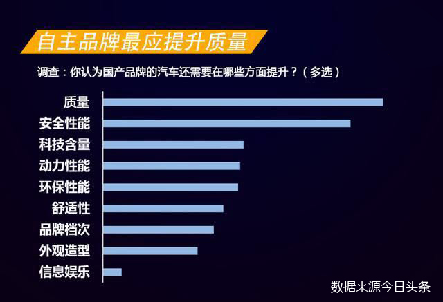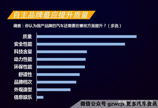 你认为国产品牌的汽车还需要在哪些方面提升?教授近来在网上获取了一个调查结果,结果显示中国的购车群体最在乎的是国产车的质量,其次是安全性能。至于外观造型以及信息娱乐这两项最为冷门,一方面是国产车在这两方面做得已经不错了,另一方面是大部分购车群体买车更为注重的内在,而不是表面,车购耐用才是王道。