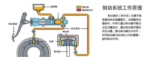 制动系统的一般工作原理是,利用与车身相连的非旋转元件和与车轮相连的旋转元件之间的相互摩擦来阻止车轮的转动或转动的趋势。