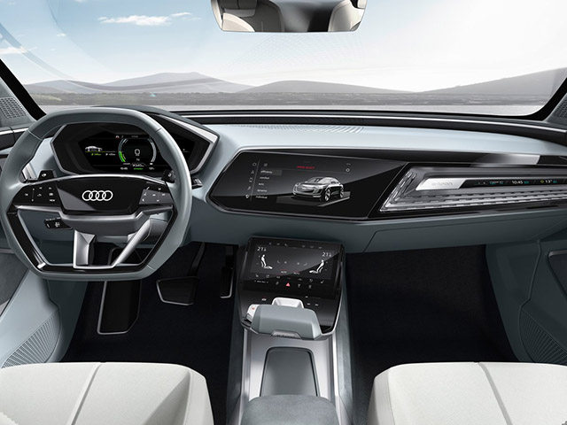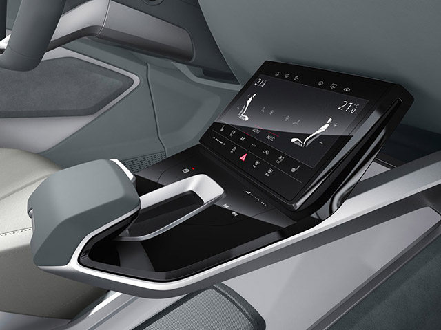 奥迪除了头灯照明很有心得之外,其实也一直有在研究内饰怎么更实用却不失科技感。于是e-tron Sportback的内饰风格也是变得相当科幻,不仅简洁,而且能放上屏的地方都装了液晶显示屏。包括中控由双屏组成,连副驾位置上了设置了一个类似液晶显示条。虽然这并不代表将来实车就如此,但很可能以后车内双屏是大趋势,而且方向盘上的logo据说还会发光。