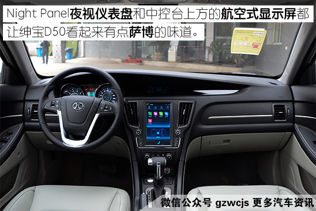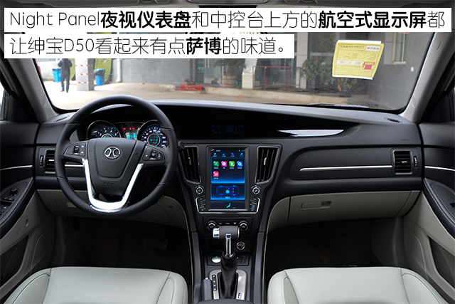 在绅宝D50的外观上还是可以看到一些萨博9-3的影子,无论是车身的比例还是前脸的线条等等,都容易让人回想起旧时的萨博。车内的Night Panel夜视仪表盘和中控台上方的航空式显示屏都有点萨博的味道,但做工和用料的质感却还是停留在几年前的自主品牌水平,不够细腻。