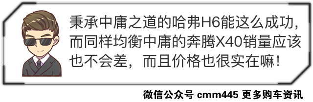 奔腾X40的上市让我们看到了一汽奔腾想要赢得更大市场份额的决心!它的设计大气、时尚,第一眼不会让你觉得惊艳,但却十分耐看。售价颇具诚意,但只要中配以上车型的配置才充足够用。1.6L发动机配合爱信6AT变速箱的匹配程度较好,平顺性和油耗是一大亮点(实测油耗仅为7.5L哟)!只是动力却很一般......